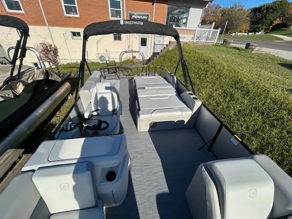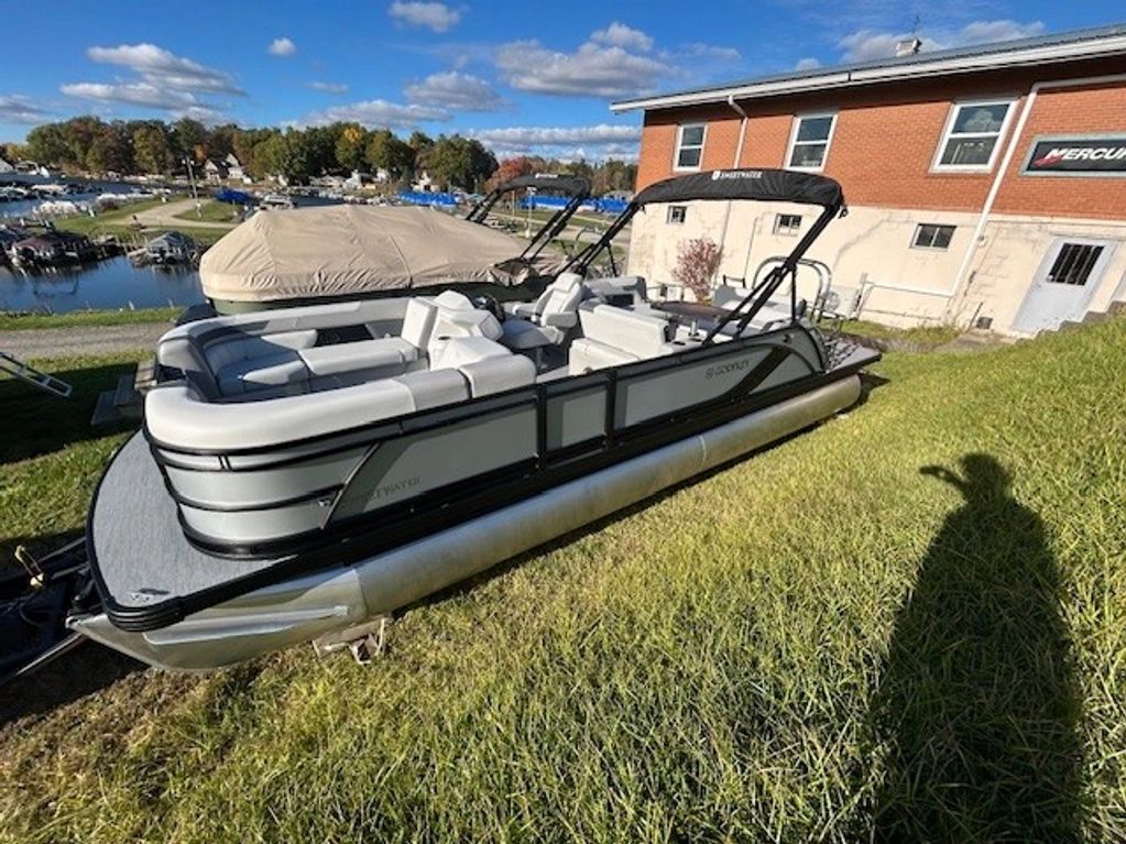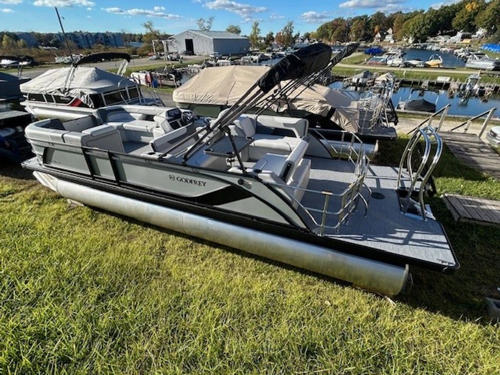 More options: Back porch package w/ SS barrier. Midnight package - black skirting w/ bow extension, black aluminum rub rail, black rails, black canopy frame, black corner caps, black ladder.